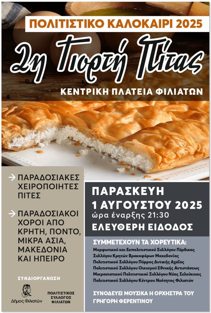 Στο πλαίσιο των εκδηλώσεων «Πολιτιστικό Καλοκαίρι 2025», ο Δήμος Φιλιατών σε συνεργασία με τον Πολιτιστικό Σύλλογο Φιλιατών διοργανώνει την «2η Γιορτή Πίτας», την Παρασκευή 1 Αυγούστου 2025 και ώρα 21.30, στην Κεντρική Πλατεία Φιλιατών.